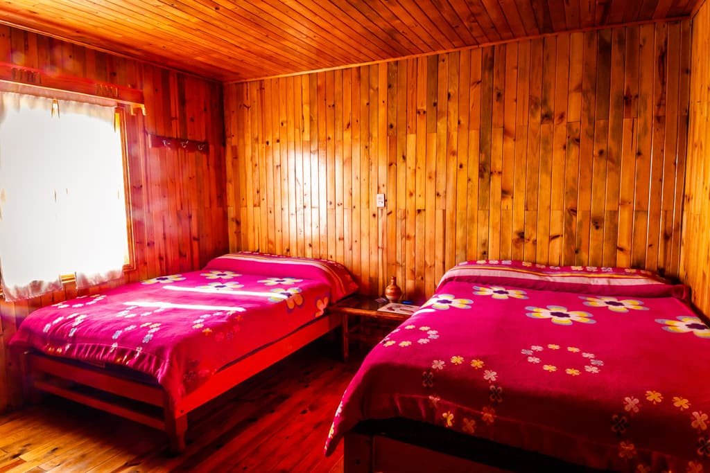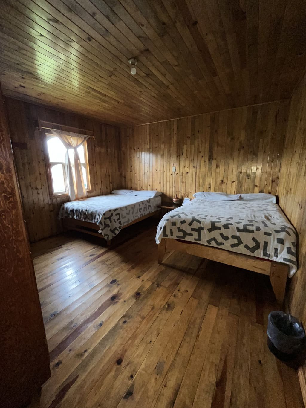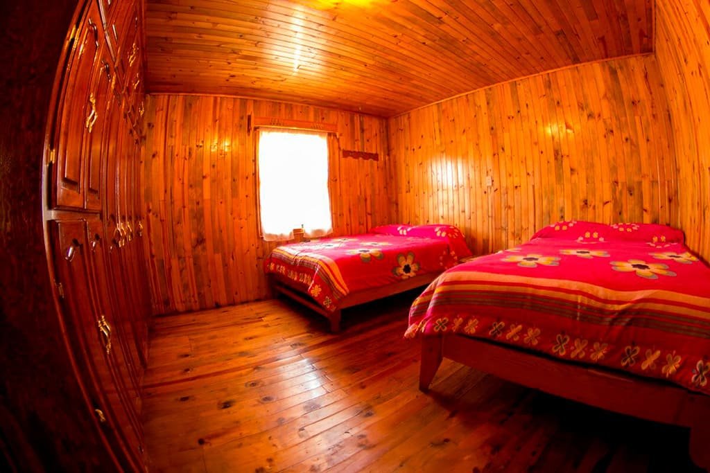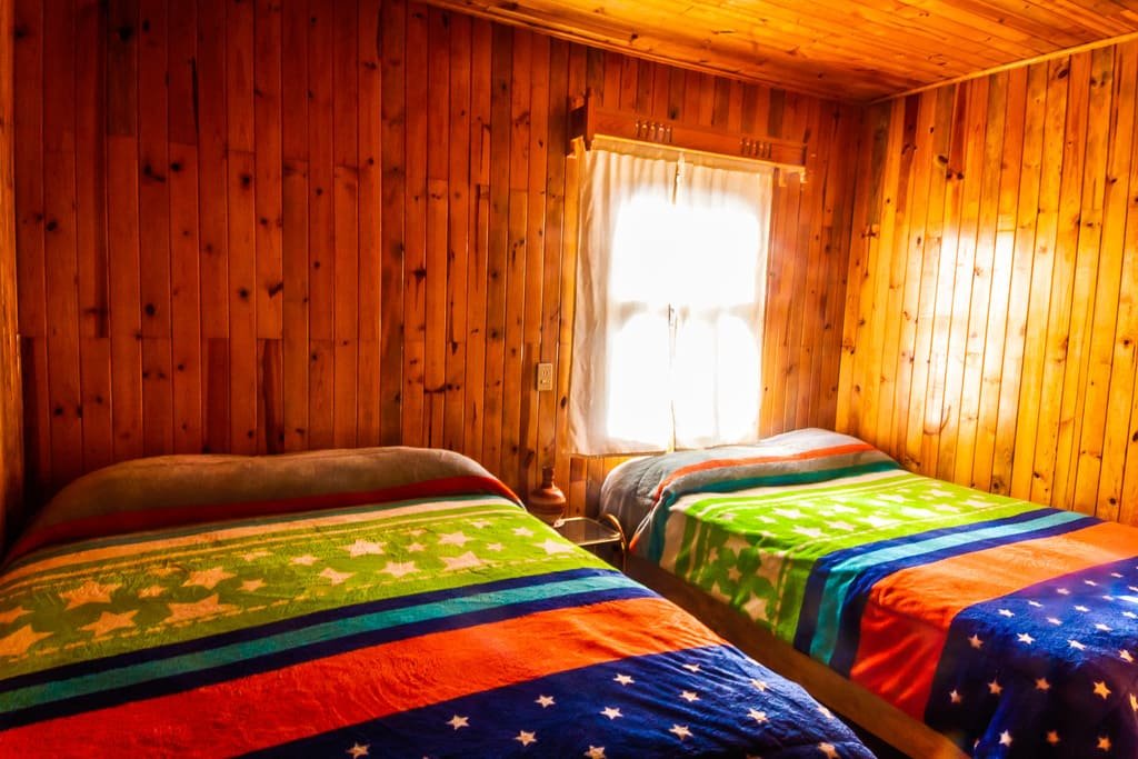 Disfruta de la comodidad y privacidad que te brindan nuestras habitaciones con capacidad para 4 personas con baño compartido, está saliendo de la habitación, se encuentra una área de baños y regaderas que se comparten con otras 3 habitaciones. Estas habitaciones rústicas de madera de pino tipo cabaña cuentan con 2 camas matrimoniales con espacio amplio y todas las amenidades que necesitas para un descanso reparador.