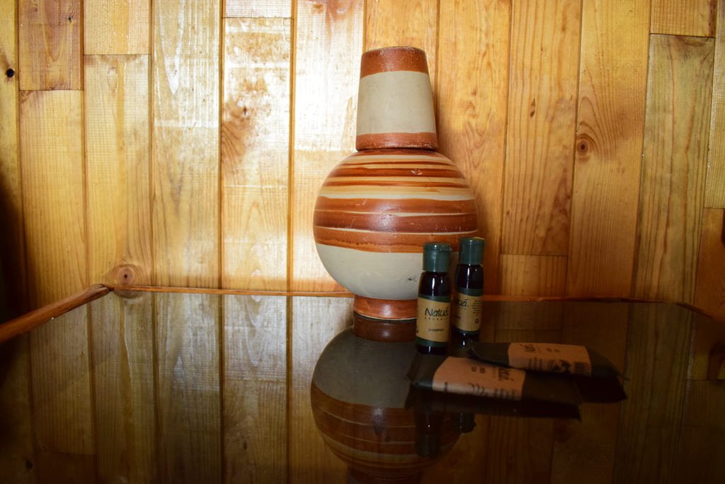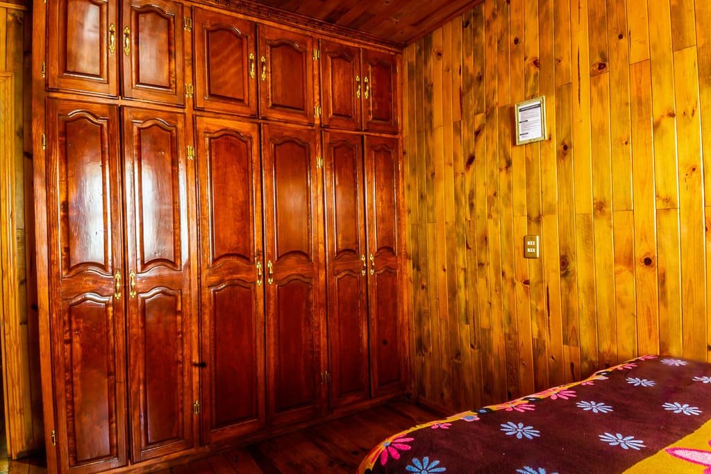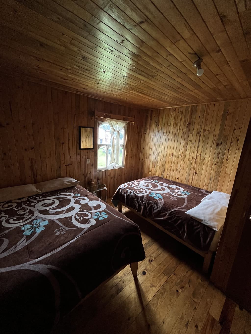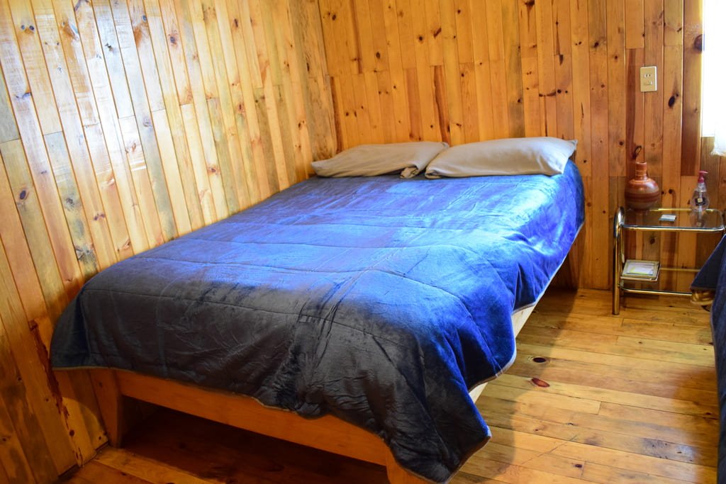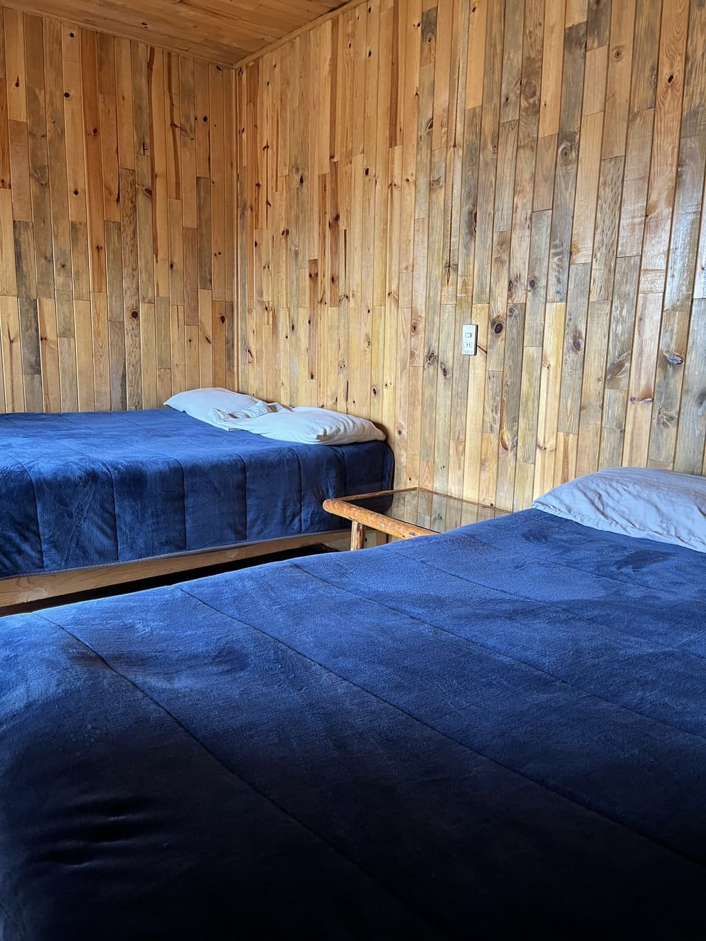 Disfruta de la comodidad y privacidad que te brindan nuestras habitaciones con capacidad para 4 personas con baño compartido, está saliendo de la habitación, se encuentra una área de baños y regaderas que se comparten con otras 3 habitaciones. Estas habitaciones rústicas de madera de pino tipo cabaña cuentan con 2 camas matrimoniales con espacio amplio y todas las amenidades que necesitas para un descanso reparador.